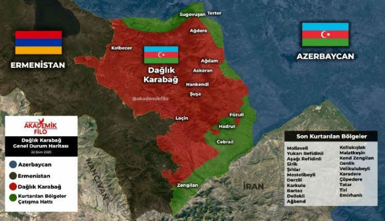 نشر المراسل الحربي في اذربيجان خريطة توضح تطور المعارك بين أرمينيا وأذربيجان على الأرض.