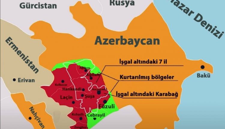 اللون الأخضر : يمثل المناطق التي قام الجيش الأذربيجاني بتحريرها من الاحتلال الارمني.